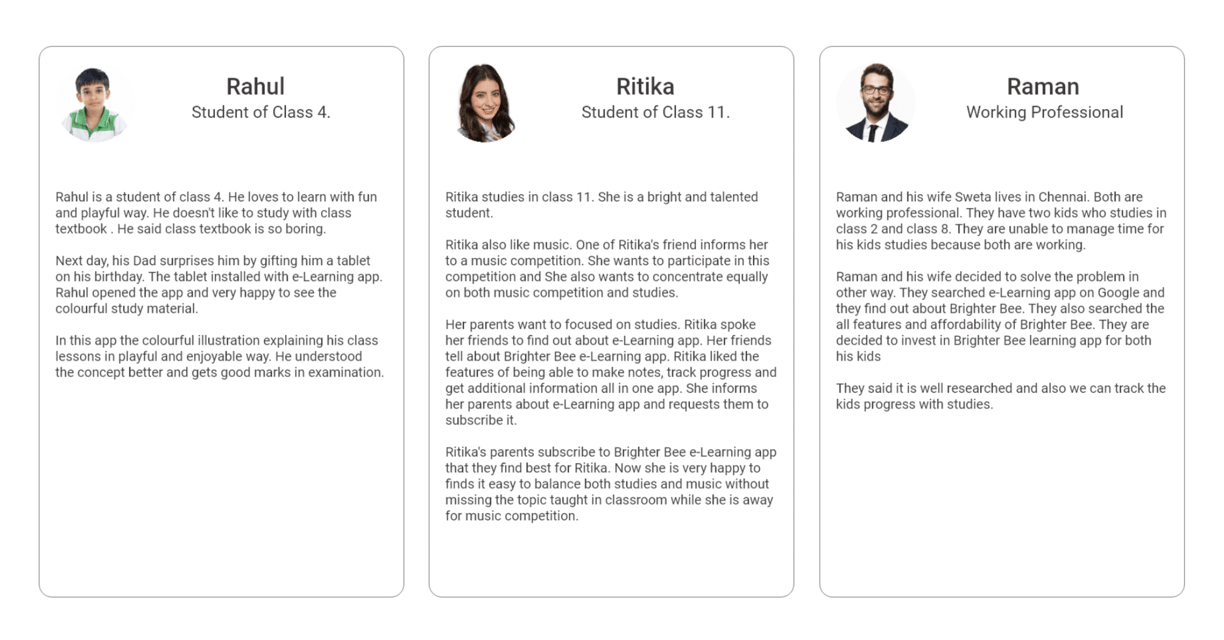 After conducting a study of the target audience, including parents and kids of different age groups, most users belong to middle-class families. The main users are kids who want to help with their studies and understand the lessons. Parents are unable to find time in their busy schedules to teach their kids. Both parents and kids are able to use smartphones.
